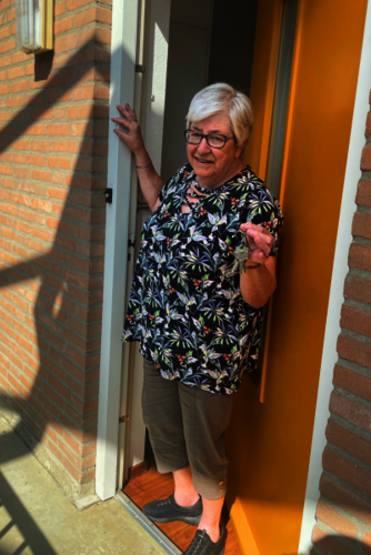 Mien hoeft zelfs haar oude buren niet te missen. 53 jaar woonden ze naast elkaar in de Willemstraat, en in het wooncomplex zijn ze -puur toevallig- weer buren. ‘Dat is bijzonder hé? Jullie komen nooit van mij af, zei ik tegen ze’, vertelt Mien. Ze voelt zich al helemaal op haar plek. Ze kijkt vanaf haar balkon uit over het groen en haar woning is modern en comfortabel. Ondanks de uitdagingen die voor haar liggen, blijft ze optimistisch: ‘Het voelt hier bijna als thuiskomen. Veel bekende gezichten, dat maakt het allemaal net iets makkelijker.’
